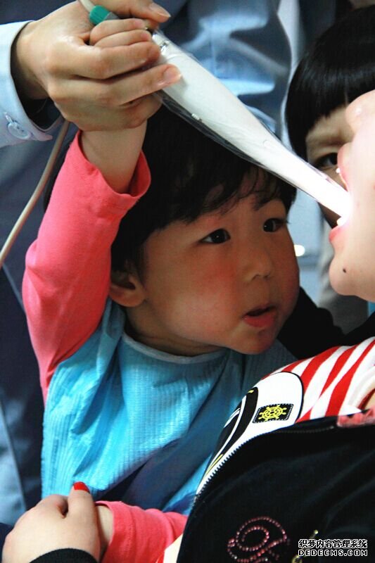 身为“牙医”势必“身先士卒”!在竹子姐姐的引导下,“小牙医”们乖乖地躺在牙椅上,好奇地盯着显示屏里自己的牙齿。时不时会听到围观的“小牙医”严厉地“训导”:“你的牙齿有洞洞,以后不能吃糖!我的牙齿很白!”看看这架势,不正是牙医的职业风尚吗!